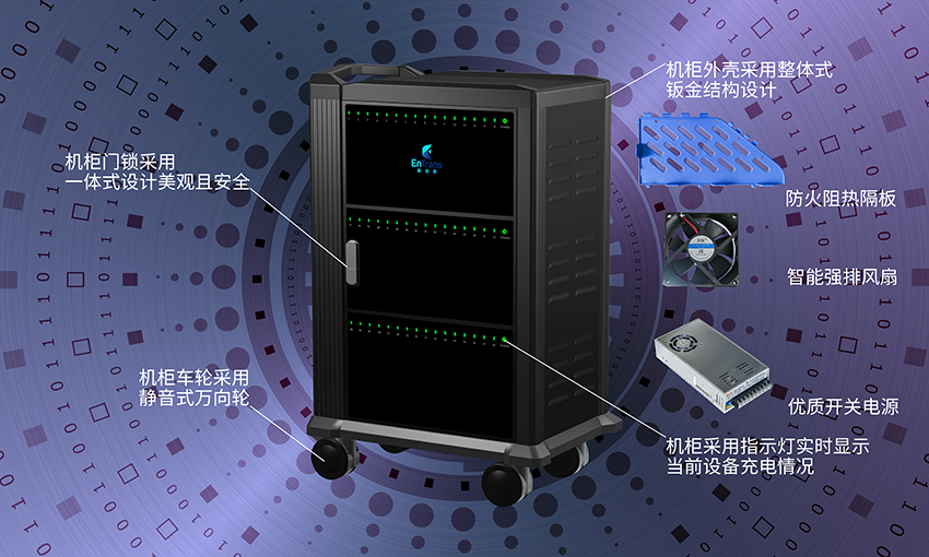 外部構(gòu)造簡單,內(nèi)部構(gòu)造也并不復(fù)雜。充電柜內(nèi)部主要構(gòu)造有ABS充電隔板,讓設(shè)備在充電時更加安全,讓其發(fā)熱起火概率無限接近于0;強勁的智能散熱風(fēng)扇會在充電柜內(nèi)部溫度達到30℃以上時,自動開啟散熱功能及時確保充電柜內(nèi)部發(fā)熱安全問題;優(yōu)質(zhì)的開關(guān)電源為整個機柜的提供高安全高效率的充電體驗,一個簡單的內(nèi)部構(gòu)造能夠使設(shè)備發(fā)生故障時及時發(fā)現(xiàn)故障原因然后及時解決故障提高充電柜的整體壽命,增強整個平板電腦充電柜產(chǎn)品的性價比。